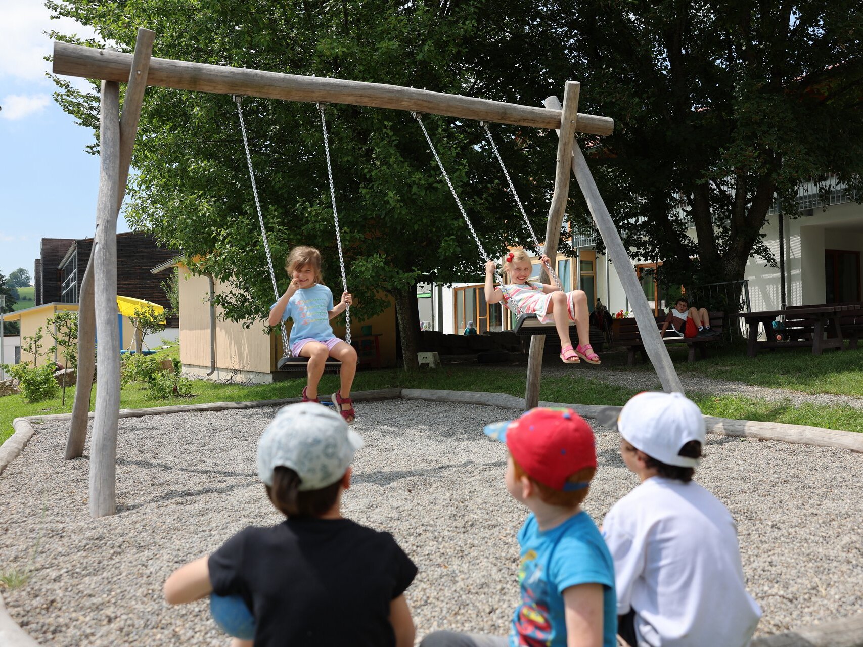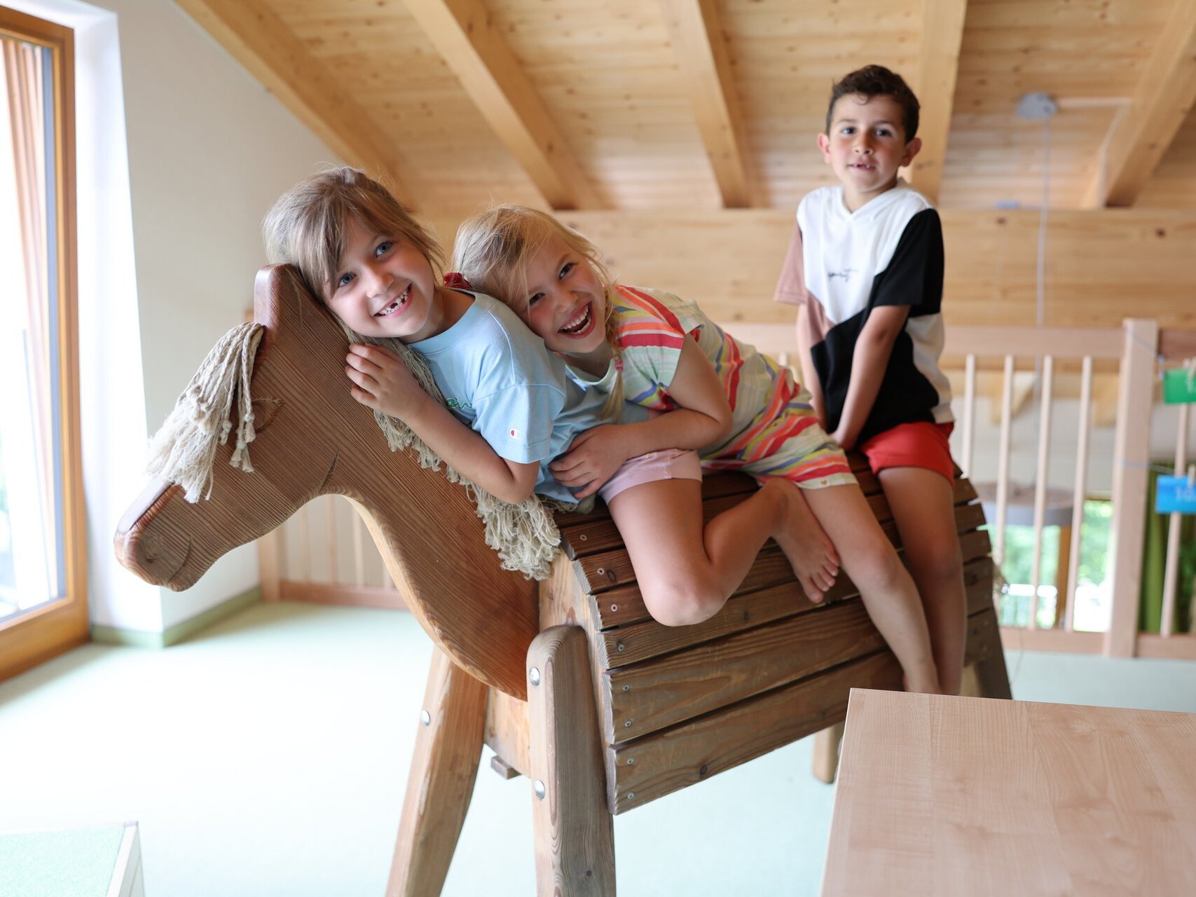 Der Kindergartenbereich besteht aus vier sehr großen Gruppenräumen mit Galerie, zu denen jeweils eine Garderobe und ein Waschraum gehören.